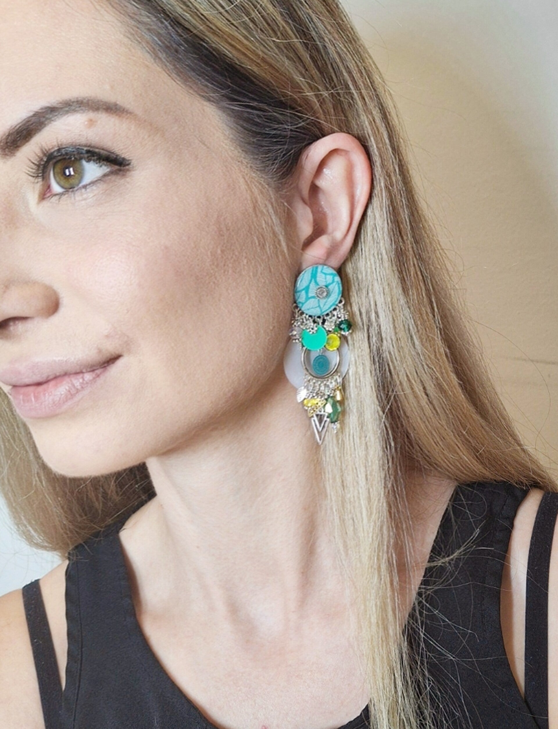 Boucles D'oreilles vert, blanc, jaune, or et Argent .